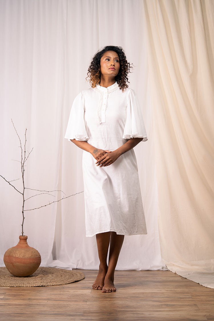 A dress with bell sleeves comes with hand made crochet lace in front.