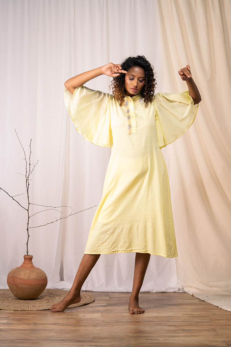 'A BLOOMING FLOWER' Pastel Yellow Mulmul Cotton Dress