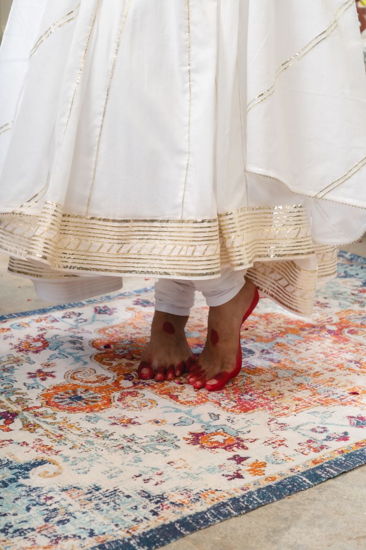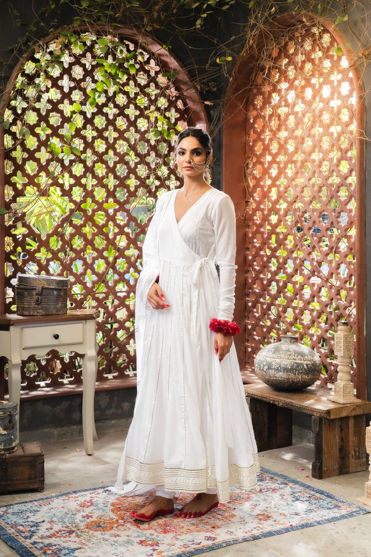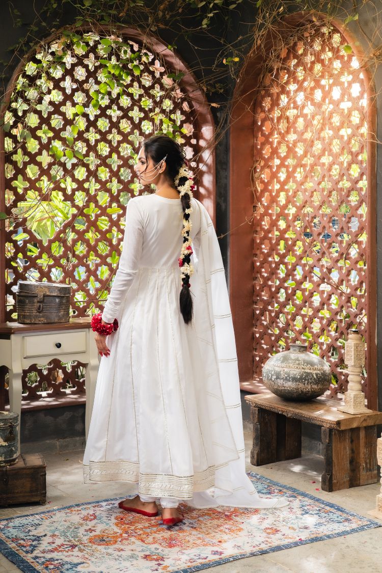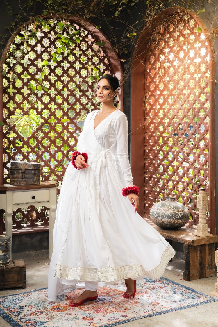 Pure mul cotton Anarkali set with our signature handcrafted gota work, paired with a soft cambric cotton churidar and a mul cotton dupatta.
