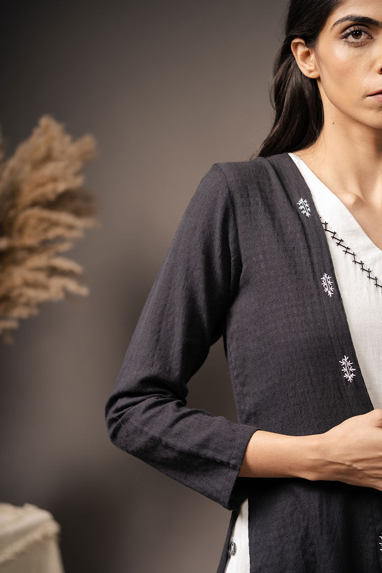 This free flowing shrug with delicate hand embroidery on buttonholes is given to give you a spotlight anywhere you walk down the street.
