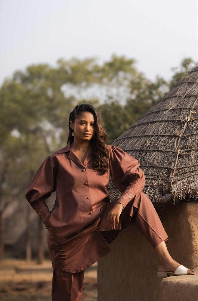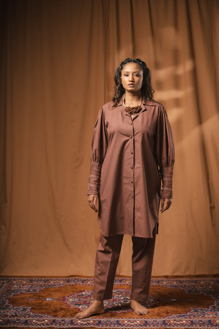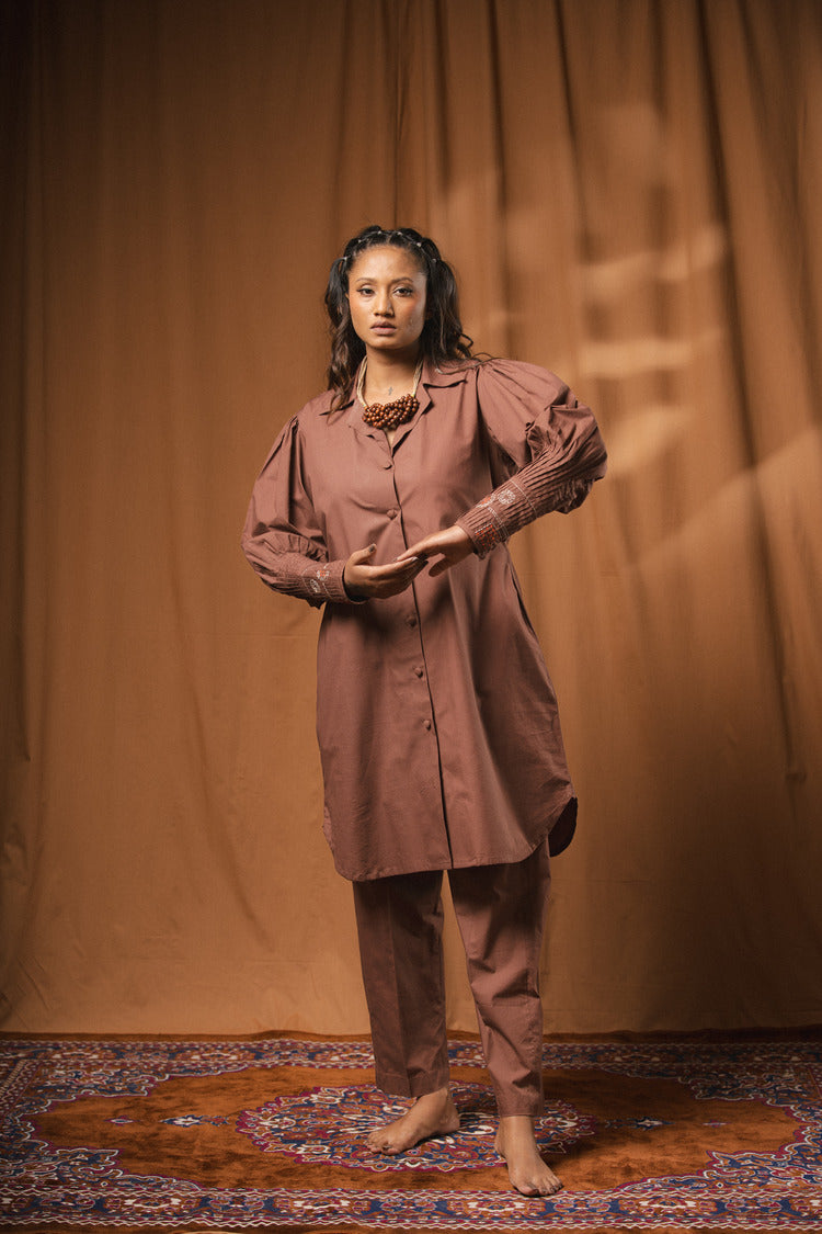 Pathani-cut button-down kurta featuring statement puffed sleeves and long cuffs with intricate hand detailing using anchor threads. It comes with comfortably loose-fitted elasticated pants.