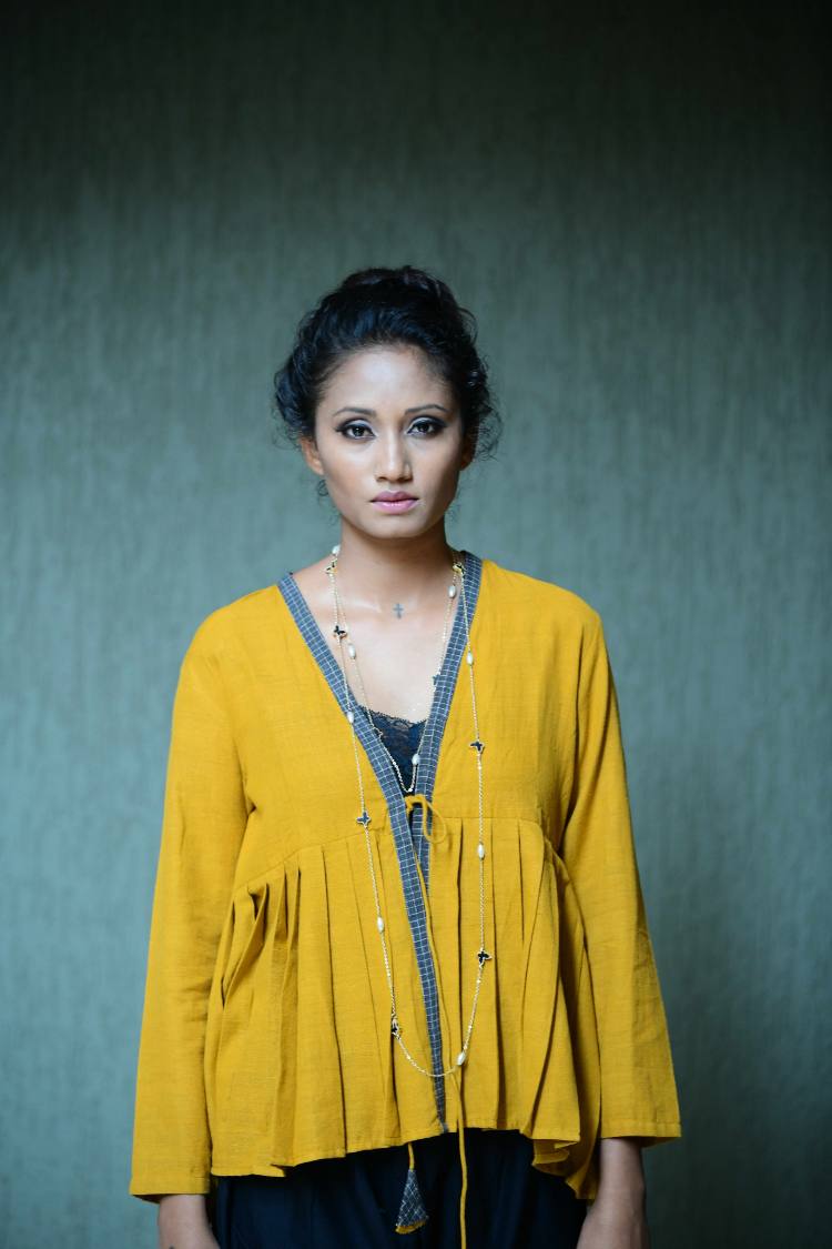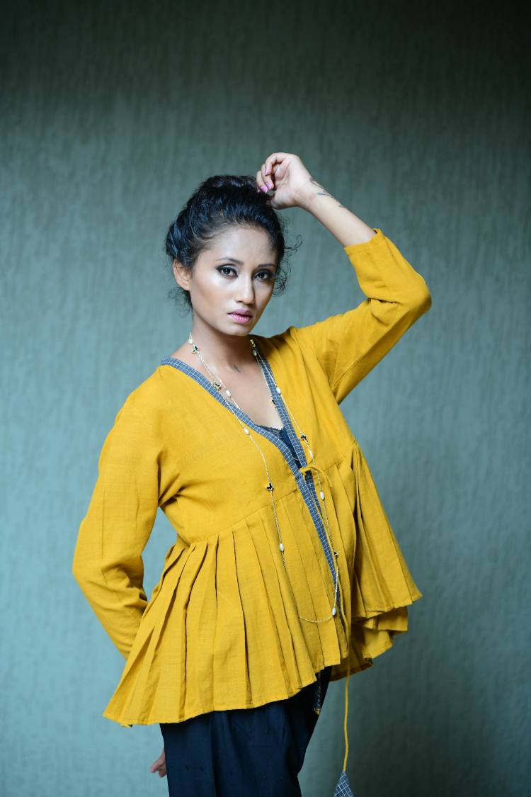 Peplum top has fine pleats and is finely finished with checkered fabric.