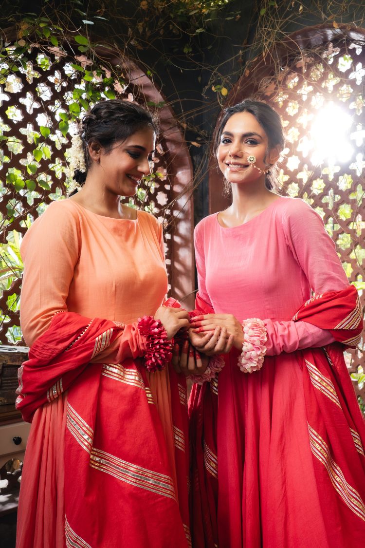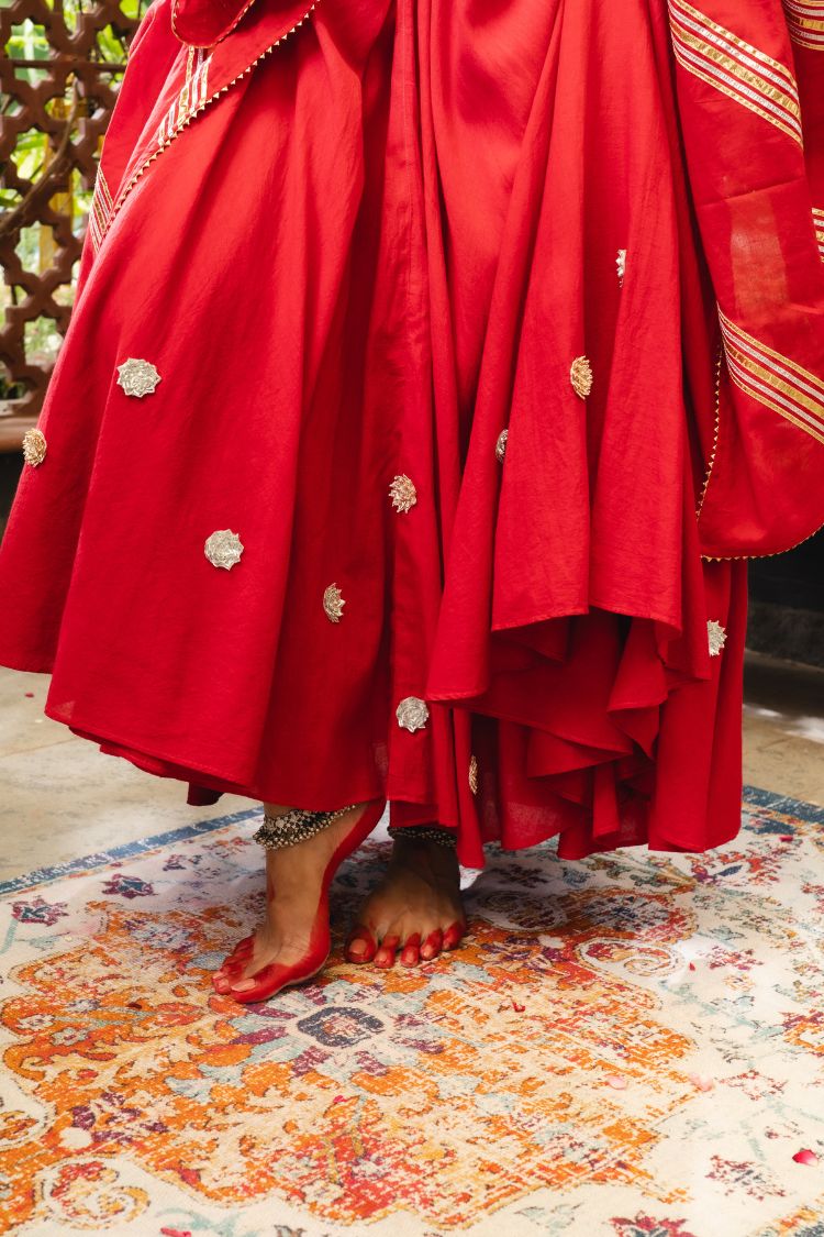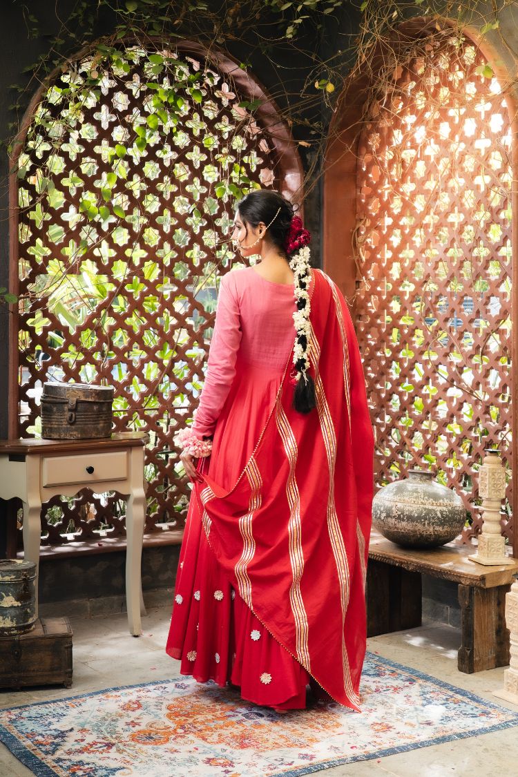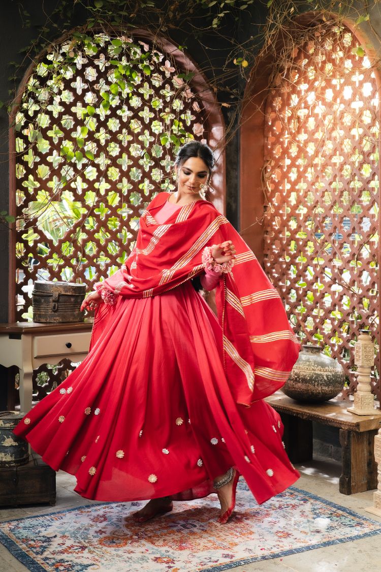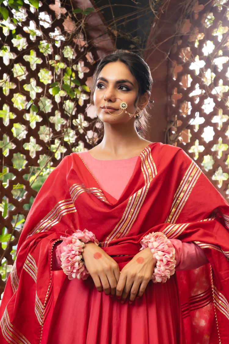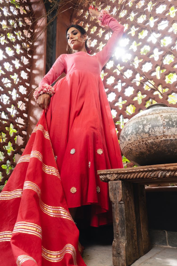 The beautiful pure mul cotton Anarkali is adorned with handcrafted gota flowers by our women artisans, paired with a soft mul cotton dupatta.