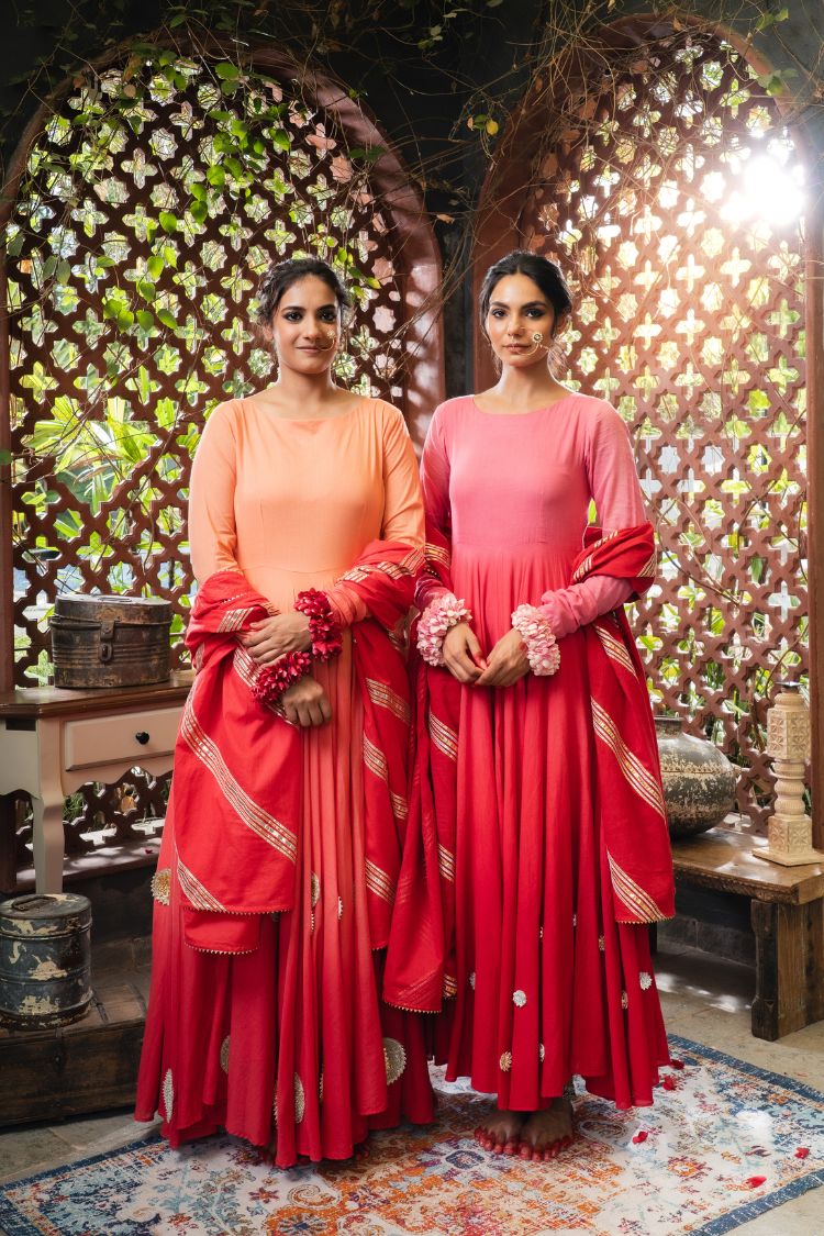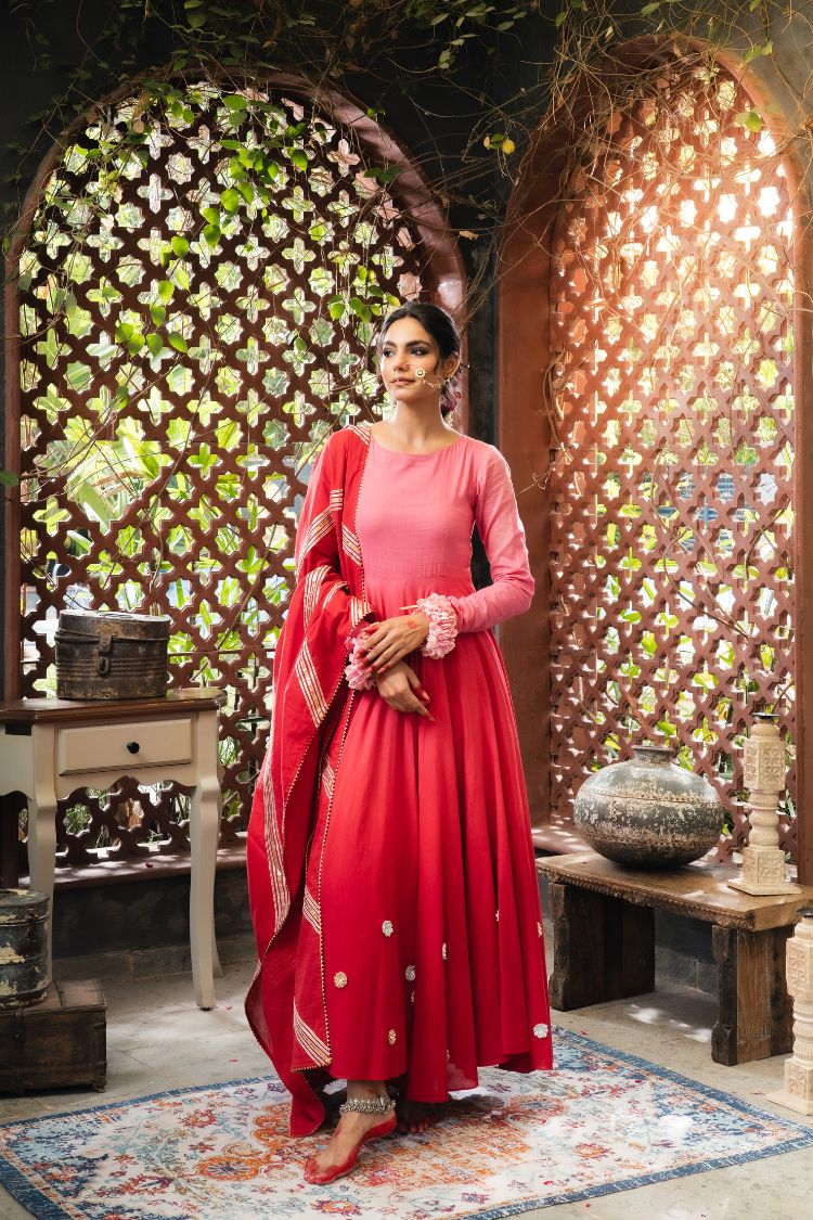 'DILRUBA' Pink & Maroon Ombré Mulmul Cotton Anarkali (Set Of 2)