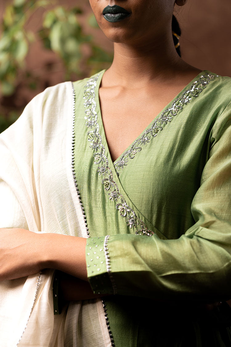 'FAQAT' Handloom Chanderi Silk Hand Embroidered Anarkali Kurta, Pant & Dupatta Set