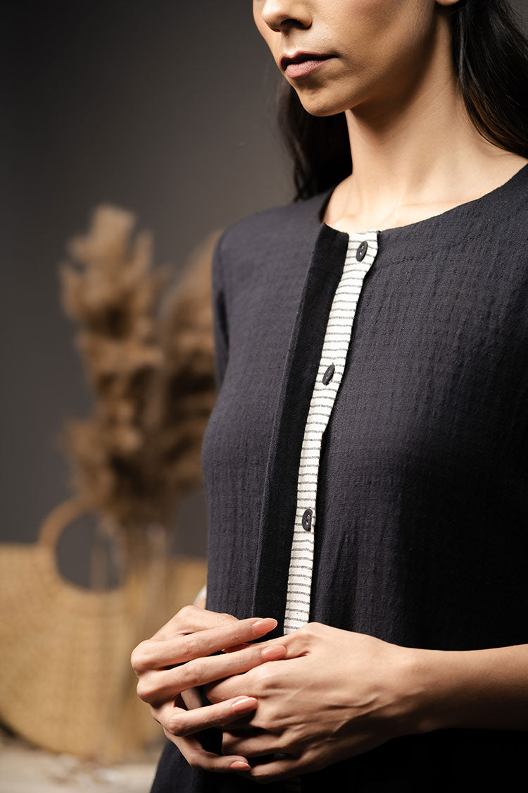 This edgy shirt dress is adorned with handwoven organic stripes fabric with concealed placket in front.
