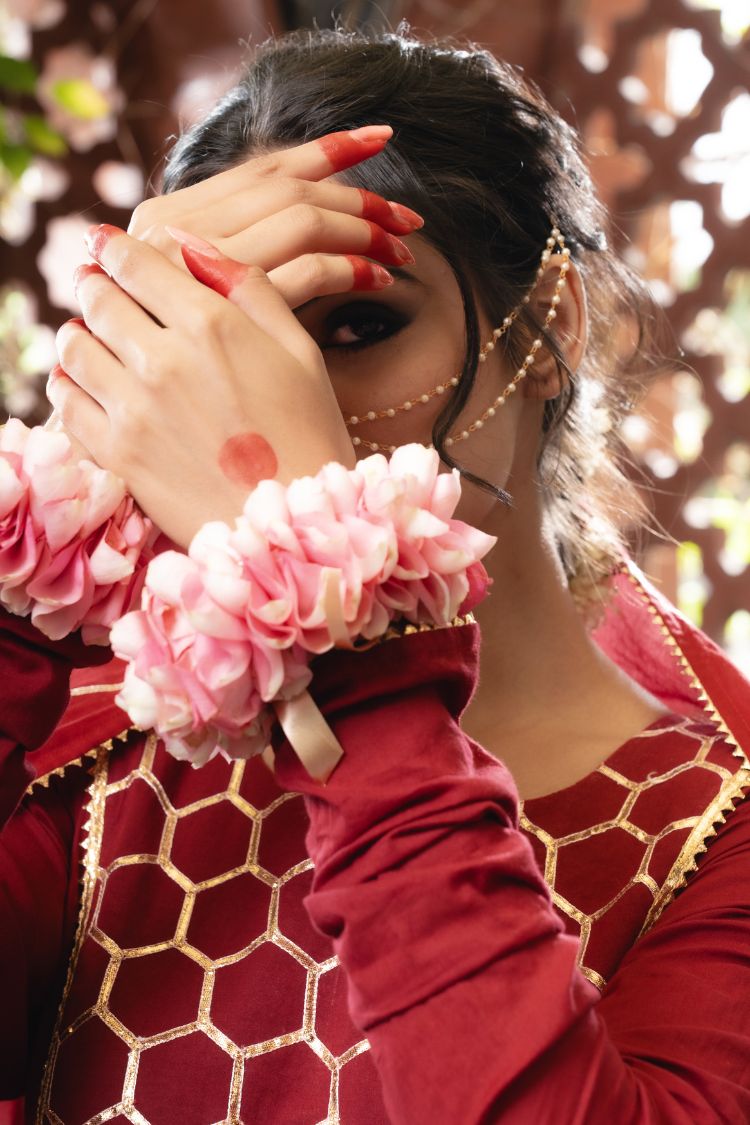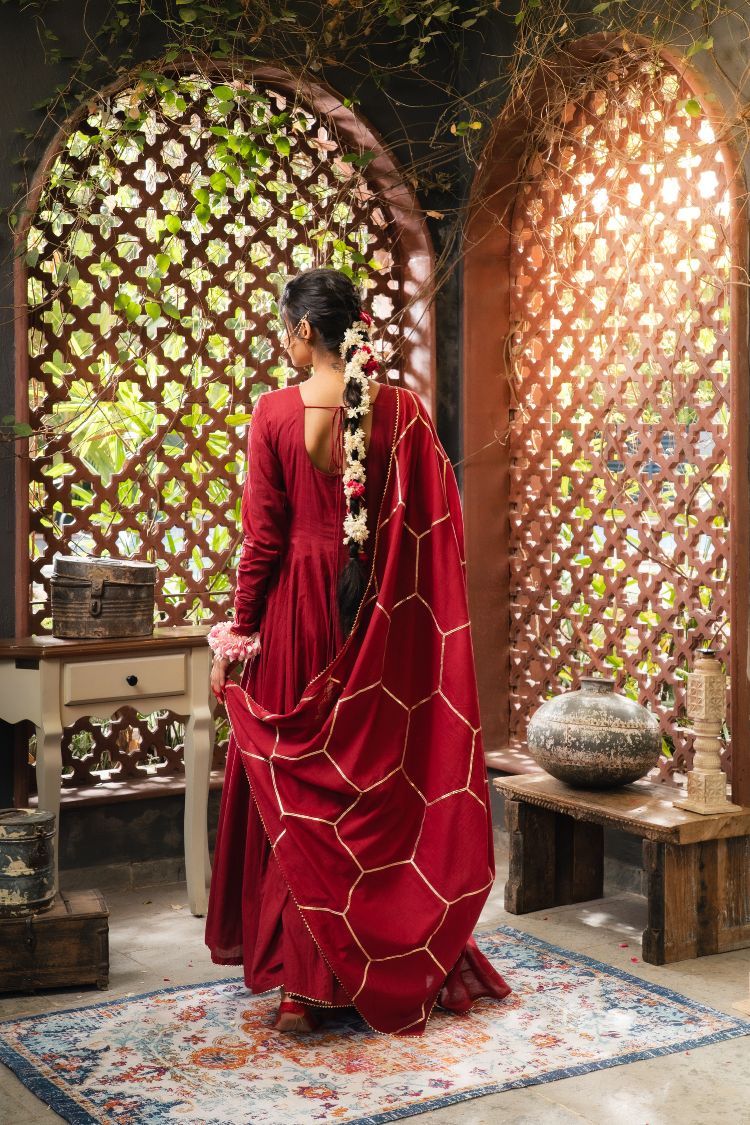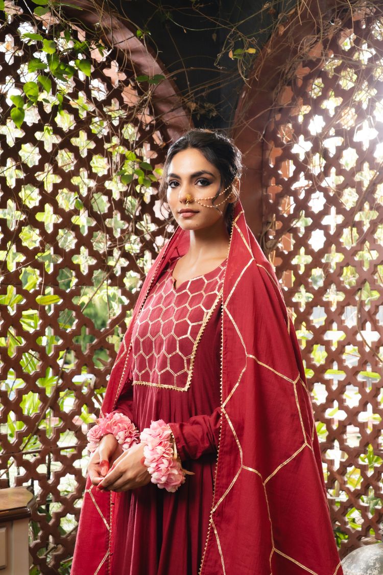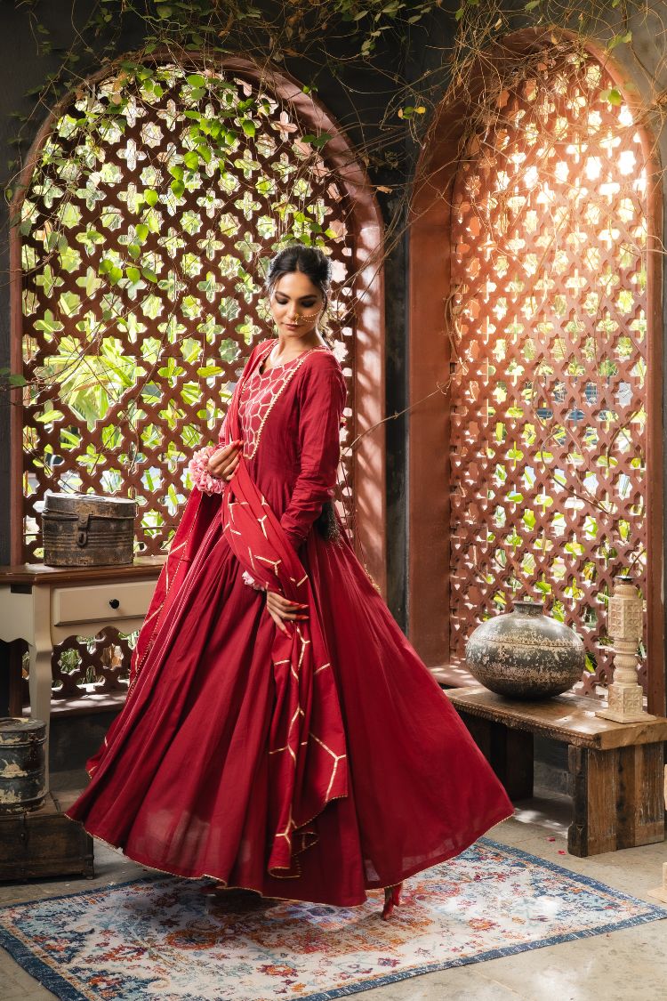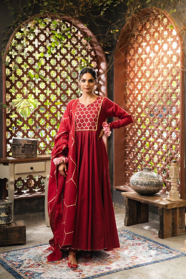 'GULABJAL' Maroon Mulmul Cotton Anarkali (Set Of 3)