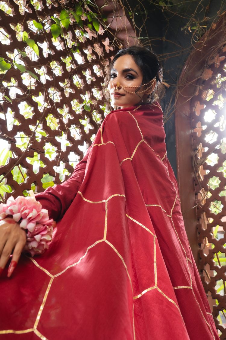 Pure mul cotton Anarkali set with our signature handcrafted gota work, paired with a soft cambric cotton churidar and a mul cotton dupatta.