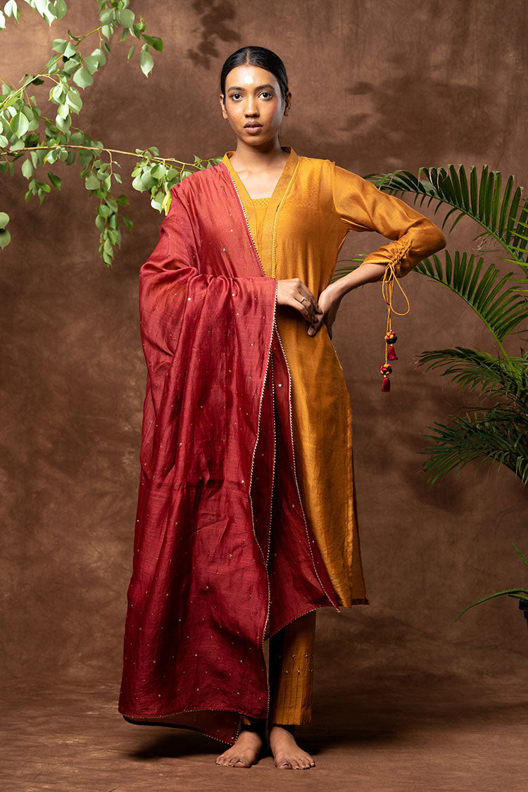 Handloom chanderi silk dupatta with hand embroidered mukaish/badla work all over and is edged with gota trimmings.