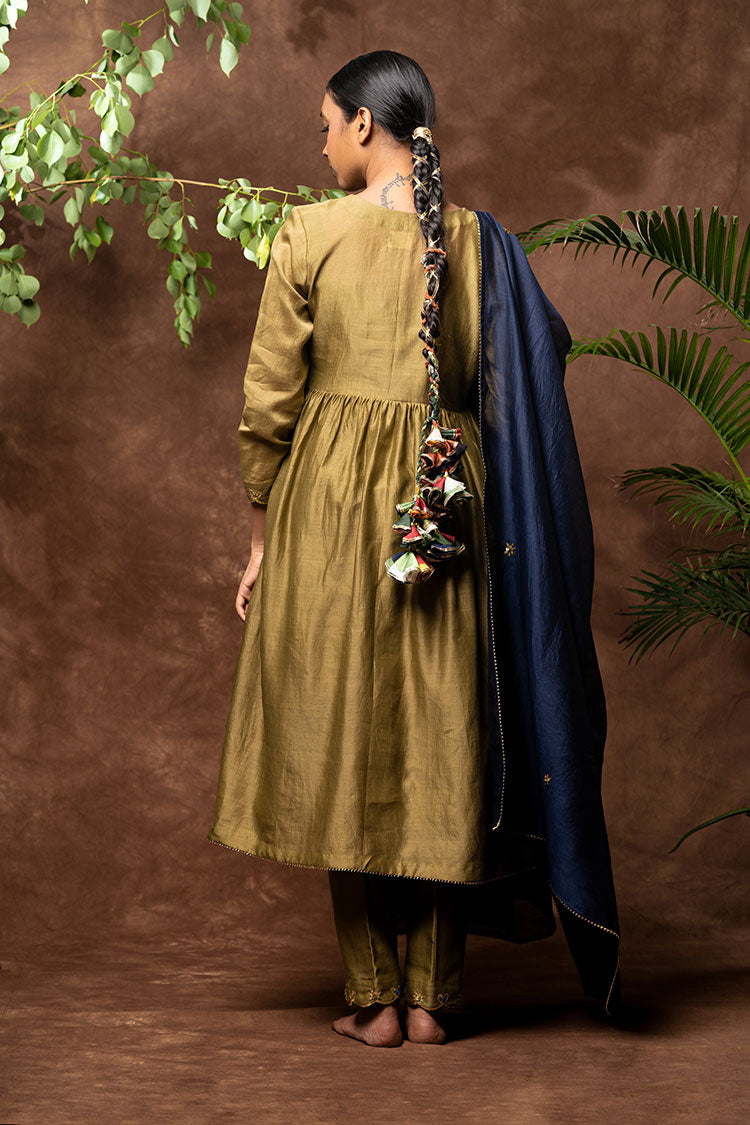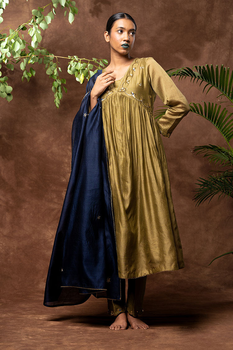 It has gathers near empire line to give comfort and flare, paired with olive chanderi