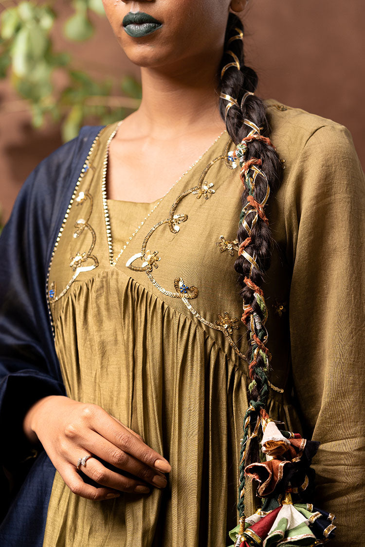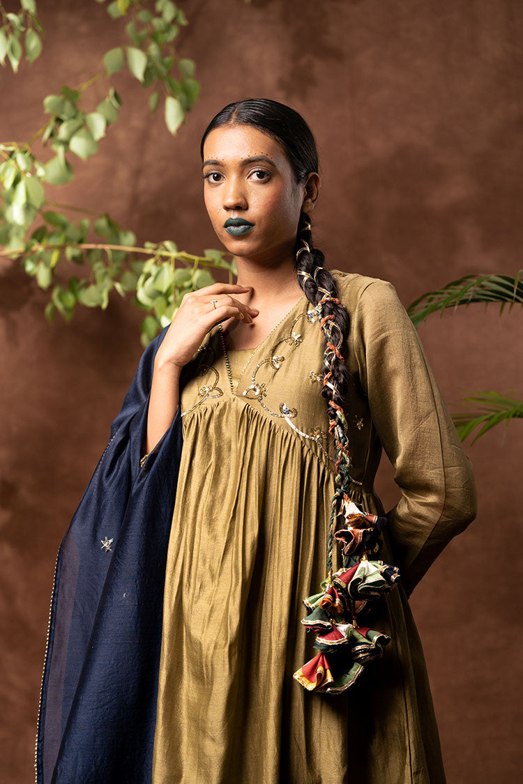 Olive green chanderi silk relaxed fit A-line kurta dress with attached slip, Comes