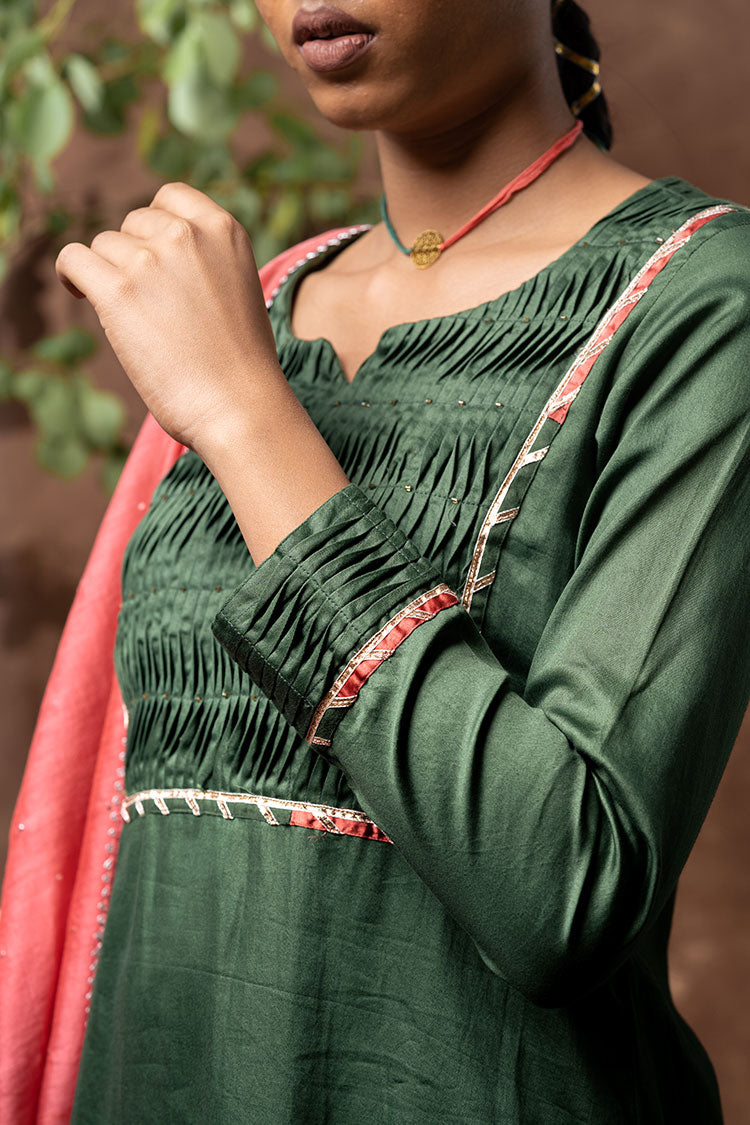 Cotton silk kurta comes with twisted pintuck yoke and sleeves and is