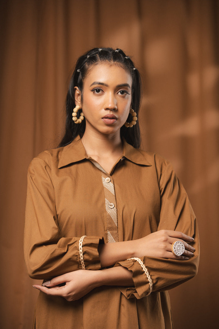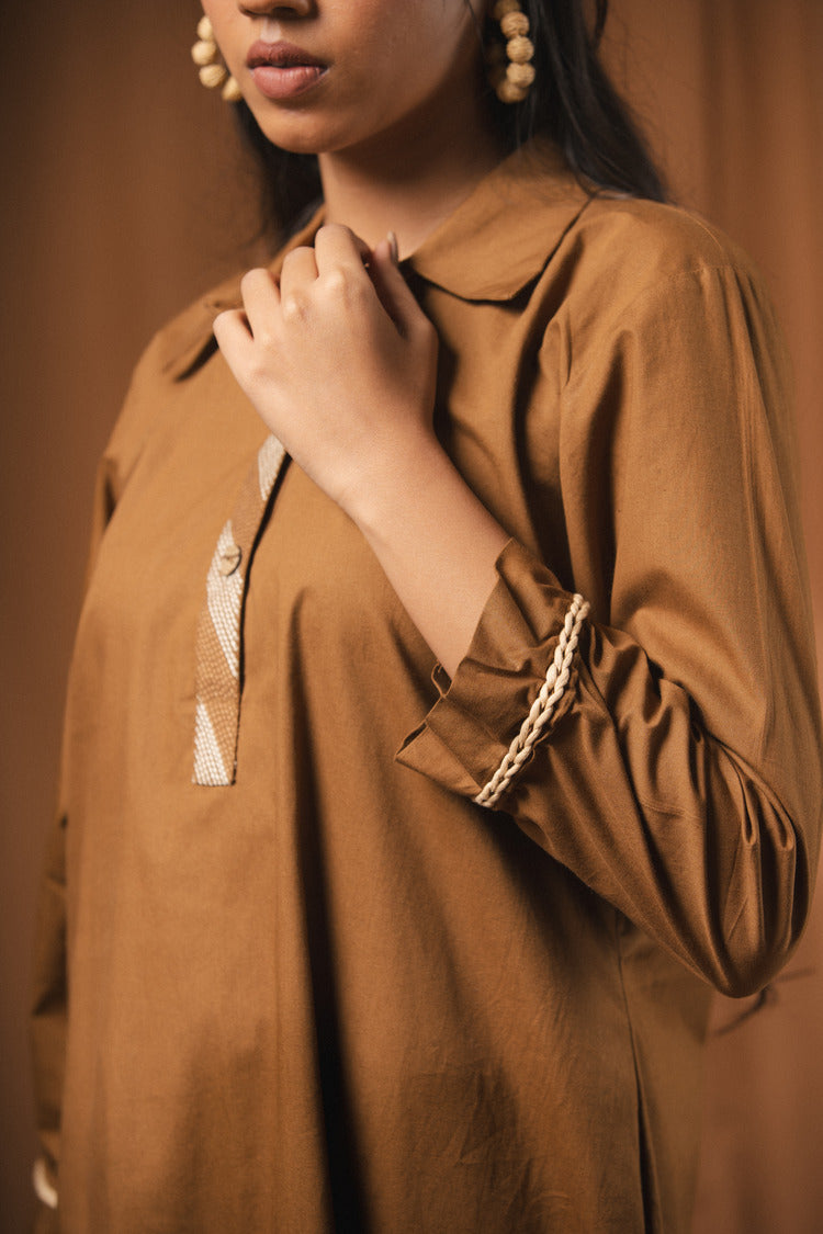 Get ready to make a statement with this dynamic co-ord set! It comes with a shirt collar and button opening for easy wear. The shirt placket stands out with vibrant contrast thread work, while the sleeves are uniquely crafted with fabric manipulation techniques. It comes with comfortably loose-fitted elasticated pants.