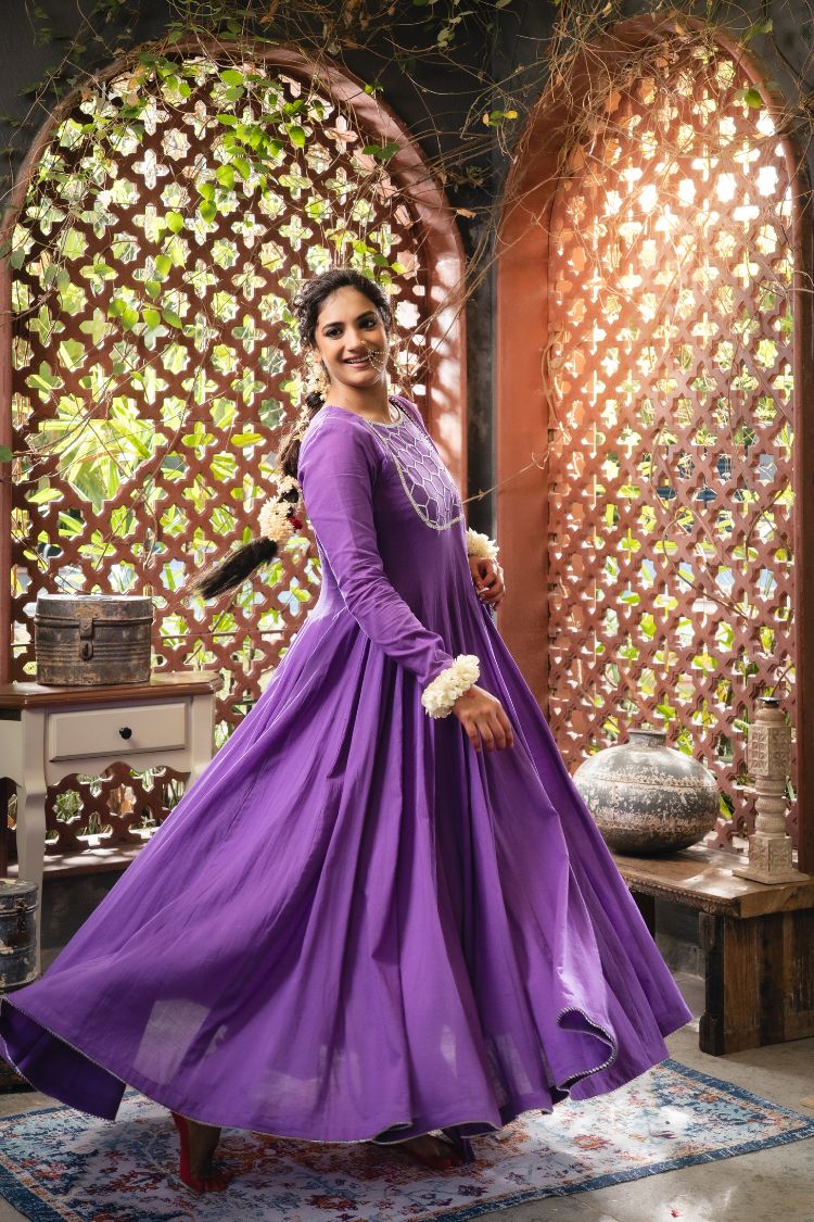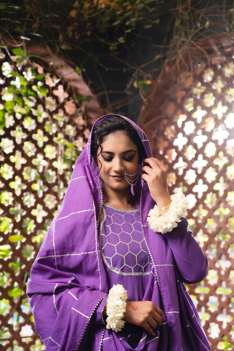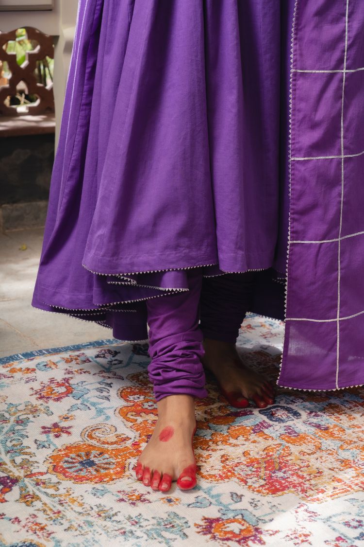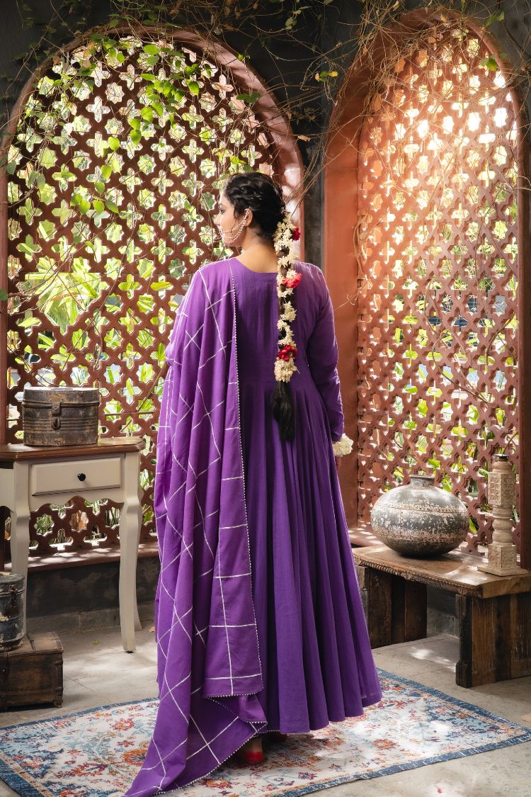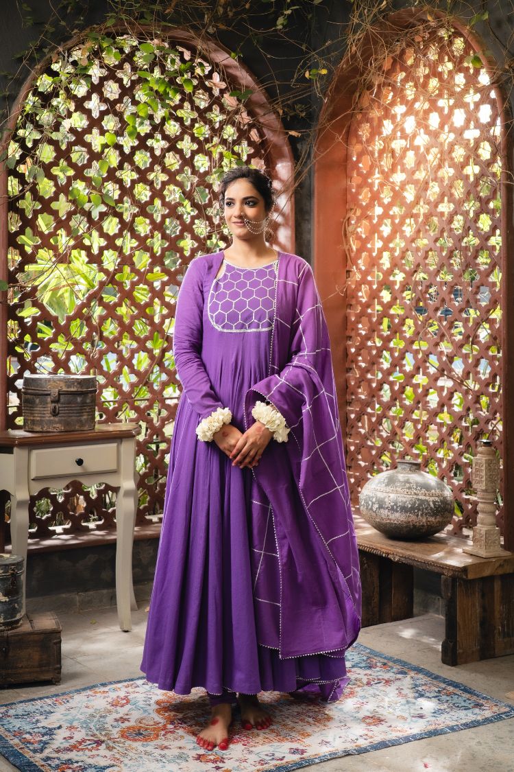 'MEHBOOB' Purple Mulmul Cotton Anarkali (Set Of 3)