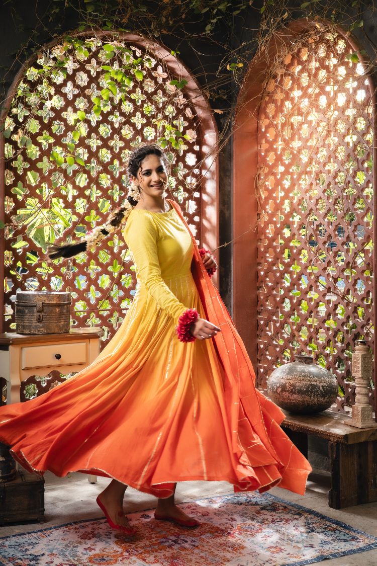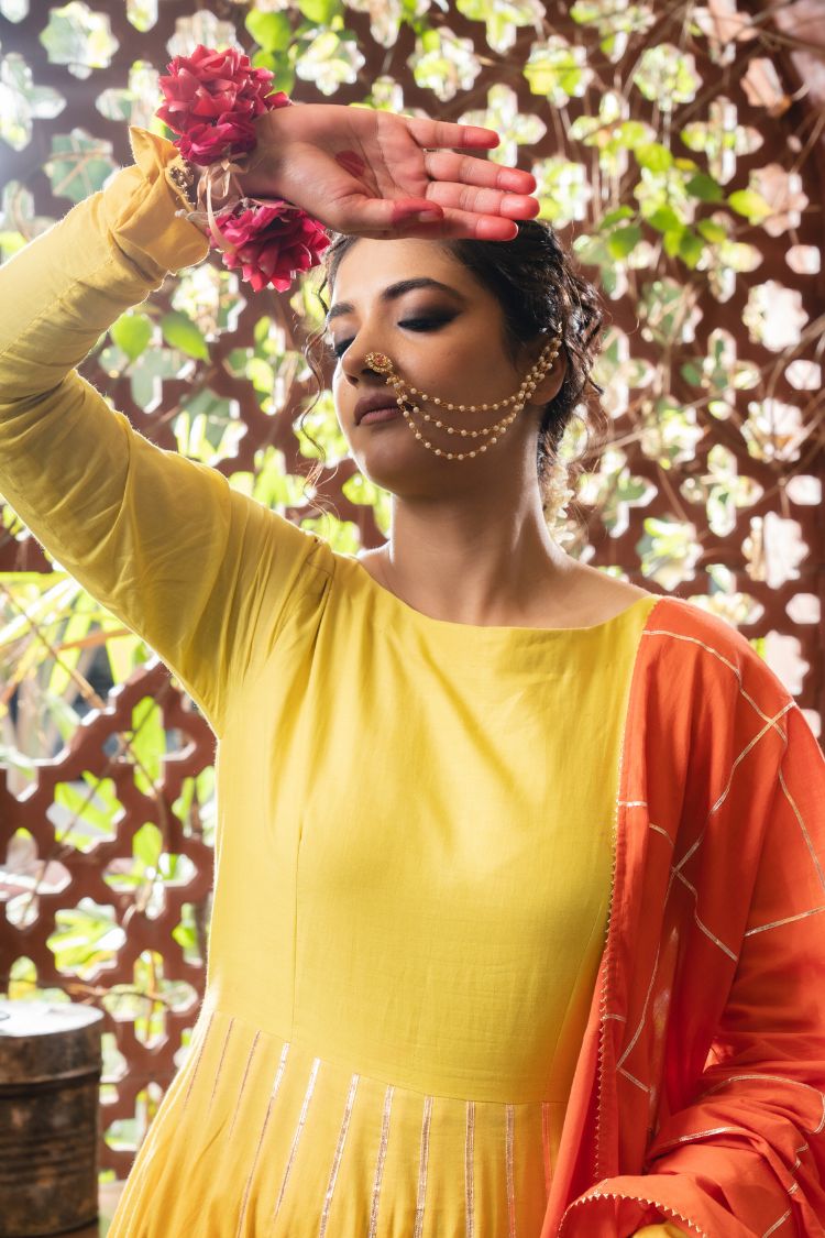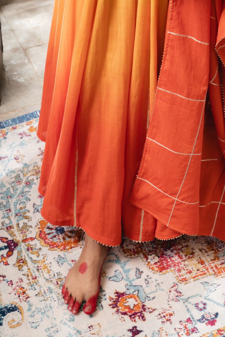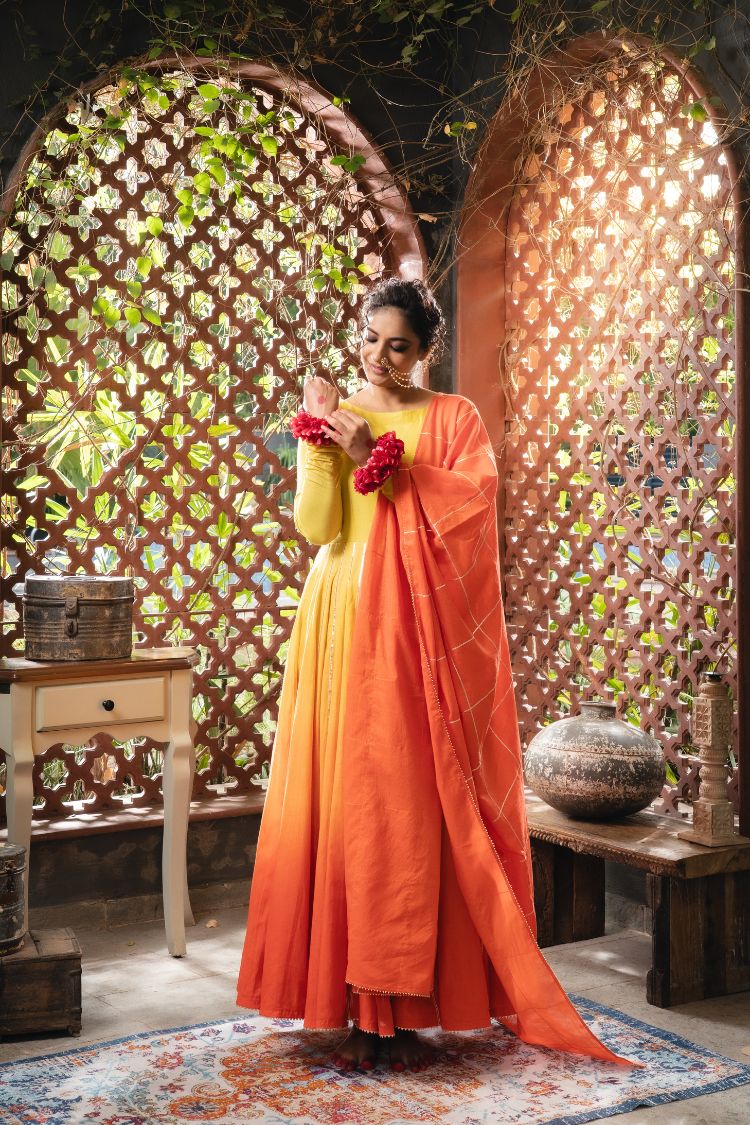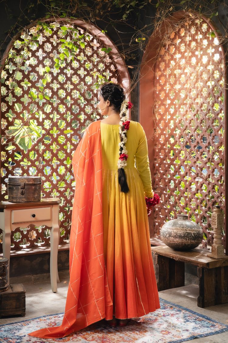 'MEHER' Yellow & Ombré Mulmul Cotton Anarkali (Set Of 2)