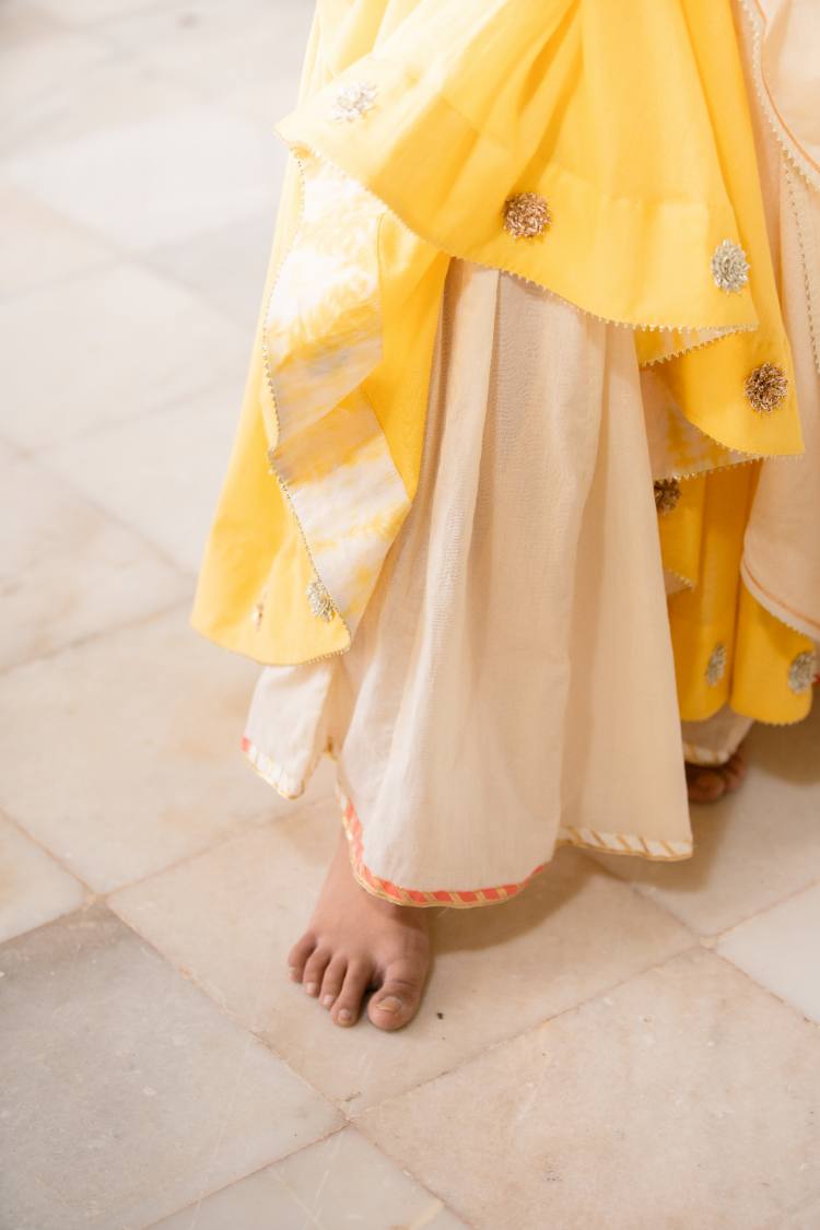 'NAKHRALI' Sunshine Yellow Mulmul Cotton Kalidar Ghaghra (Set Of 3)
