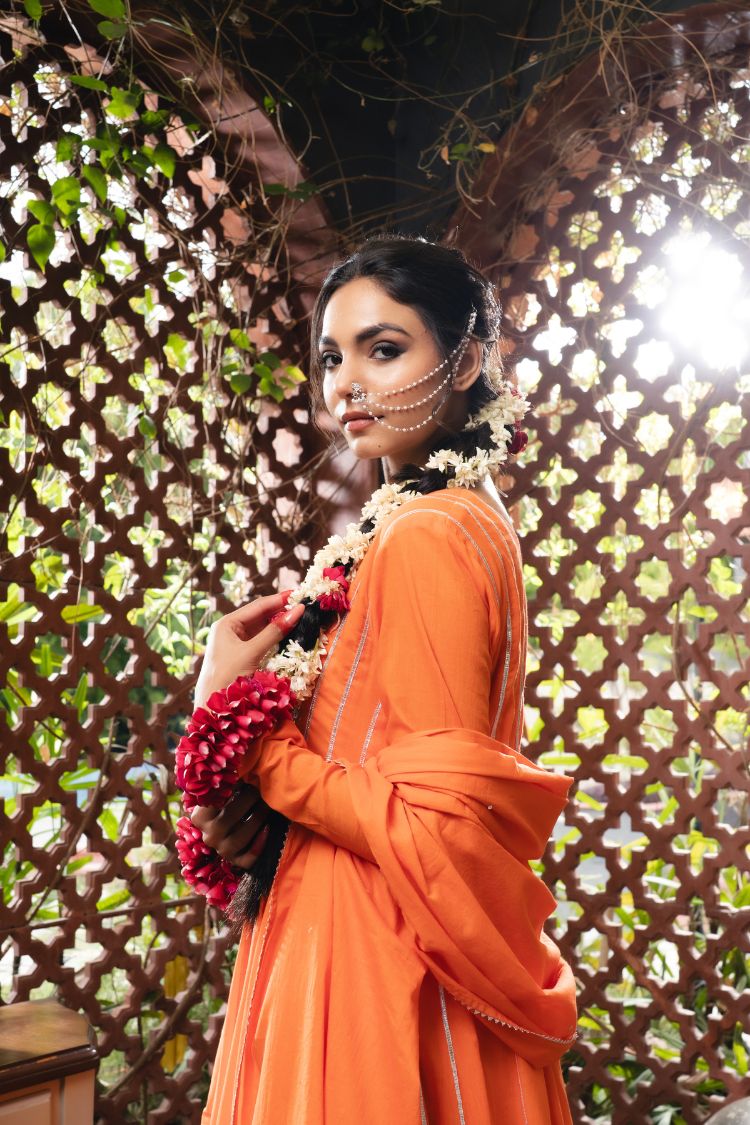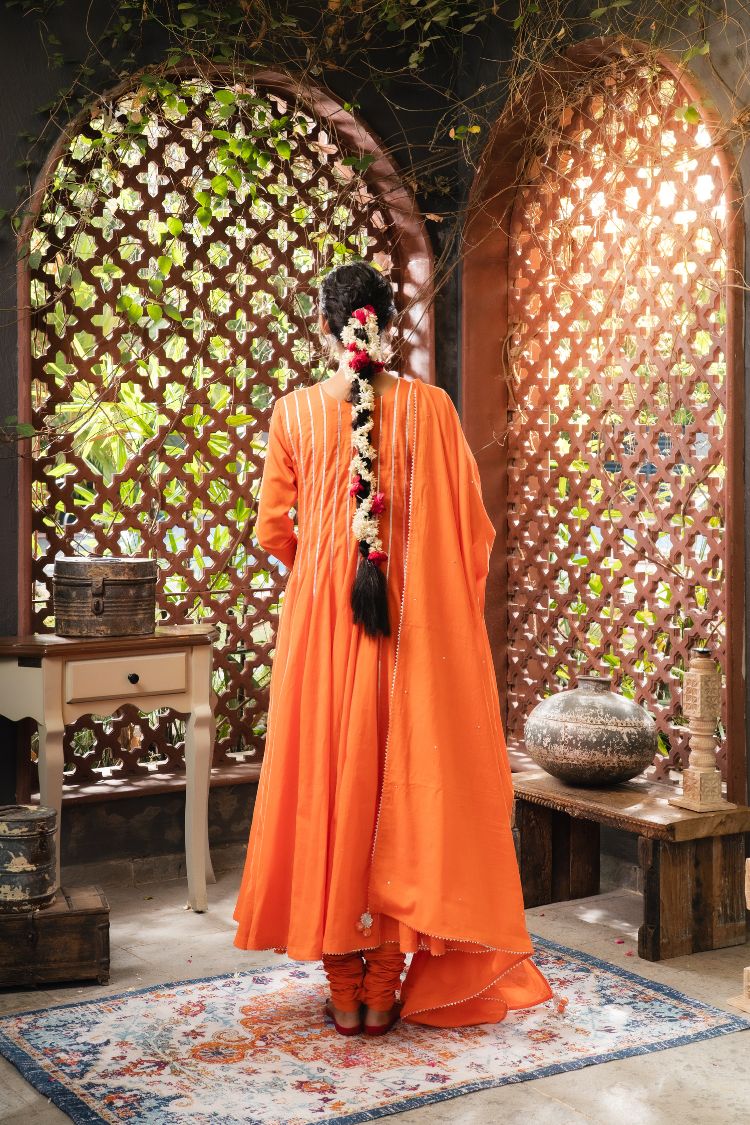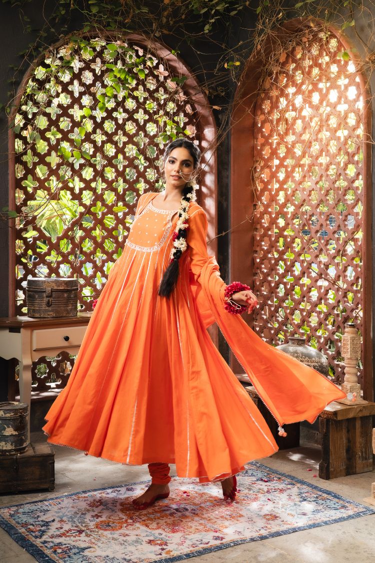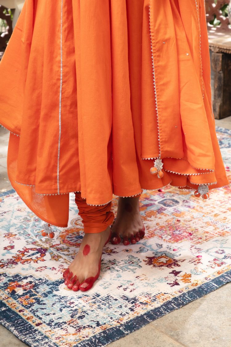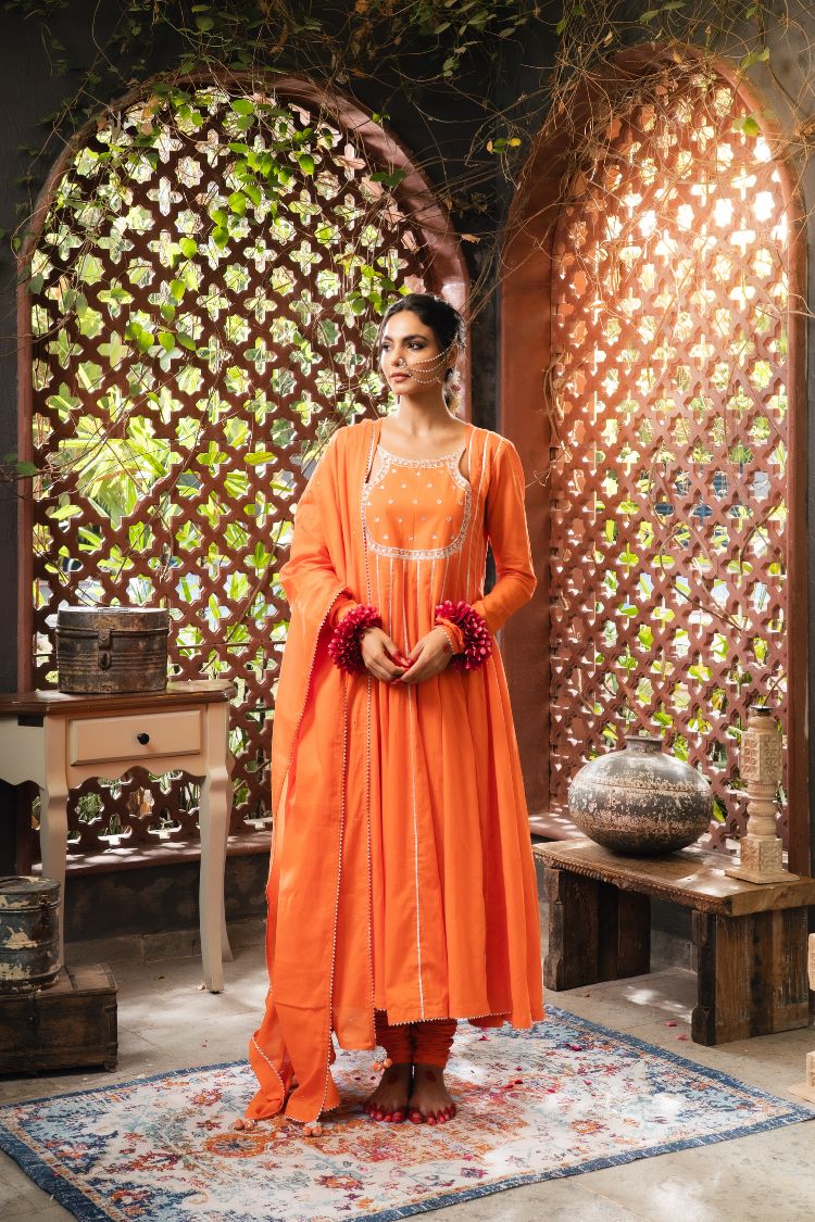 'NOOR BAANO' Tangerine Mulmul Cotton Anarkali (Set Of 3)