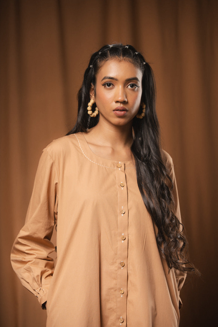 Experience sophistication in every detail with our pathani-inspired kurta. Featuring a button-down style and smocked sleeve detailing, this intricately designed piece is adorned with contrasting thread handwork throughout. It features a charming heart embroidery on back, perfect for expressing your feminine desire to stand out. It comes with comfortably loose-fitted elasticated pants.