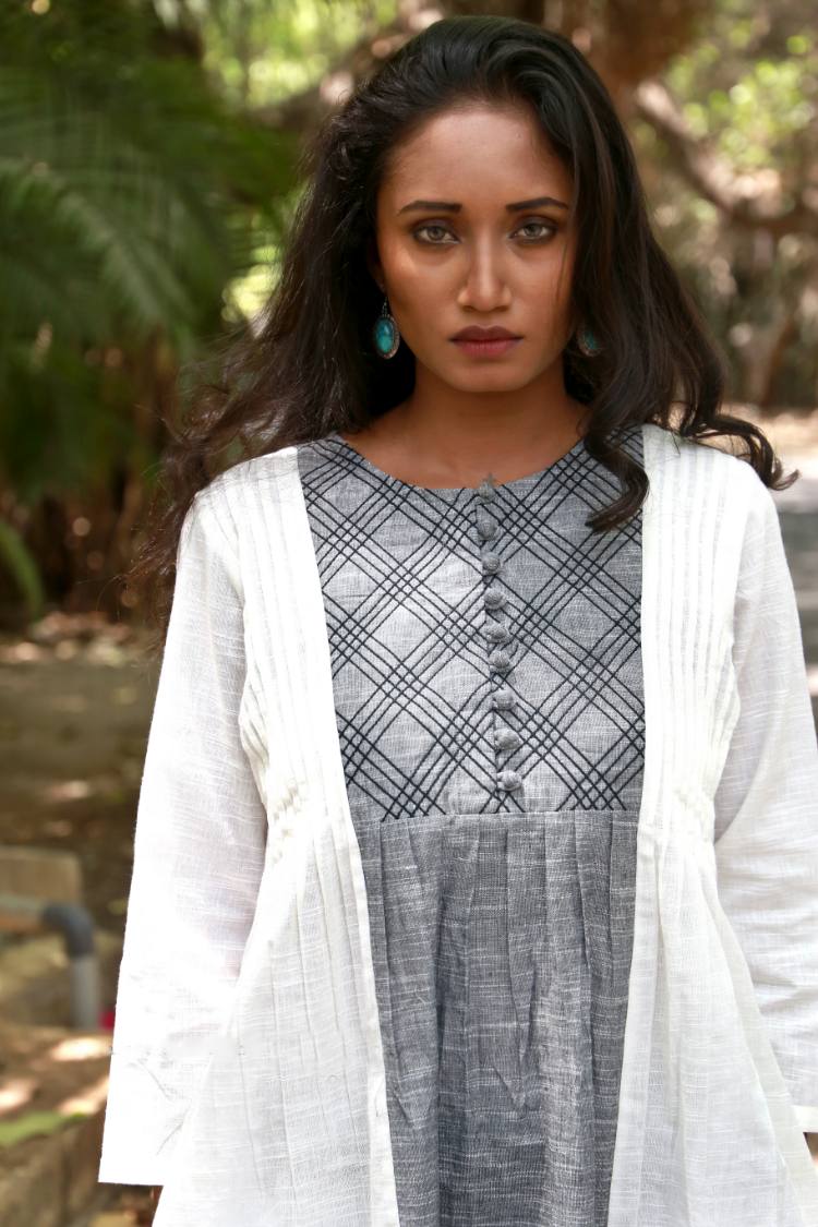 A line dress in white and gray handspun fabric is adorned with anchor detailing in front.