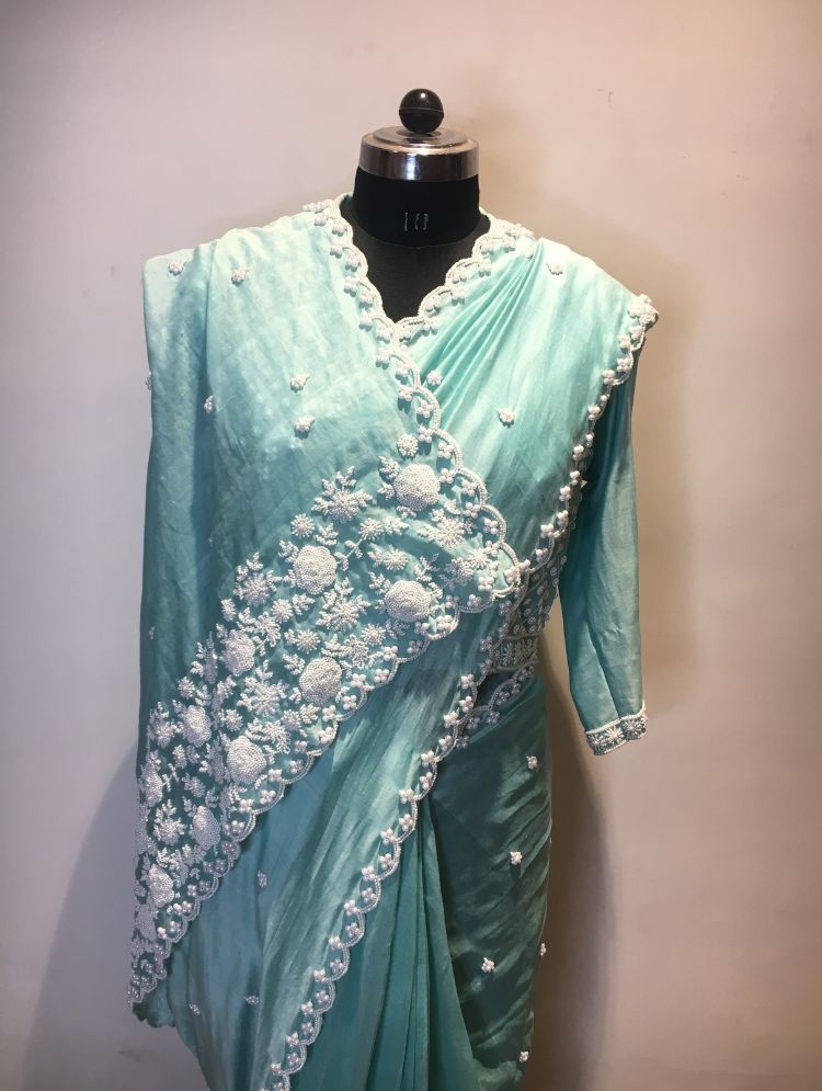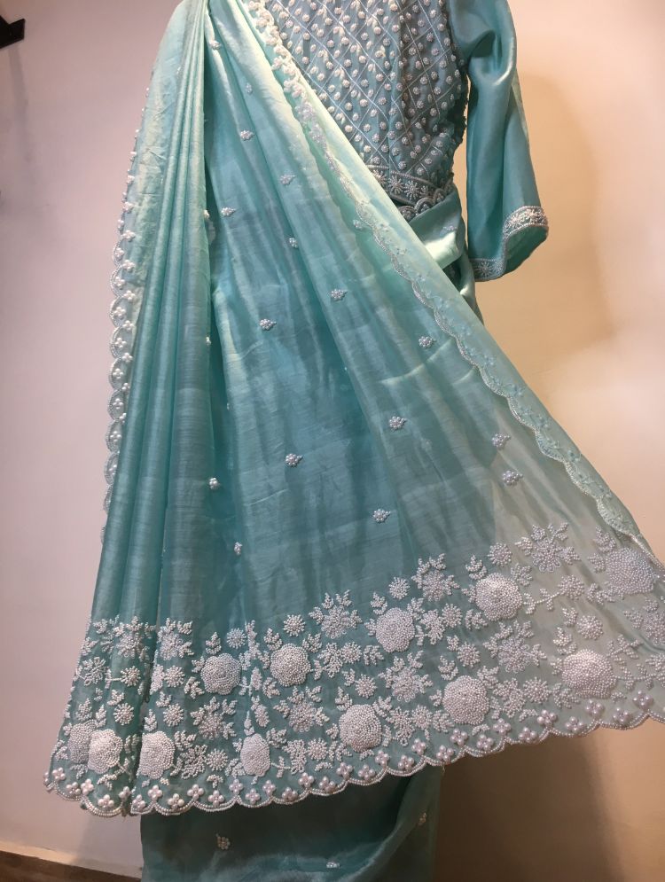 Woven in delicate handloom Chanderi silk and adorned with pearl hand embroidery, this saree takes over 50 hours to craft. Graceful, timeless, and rooted in tradition — it’s more than a saree, it’s an experience.