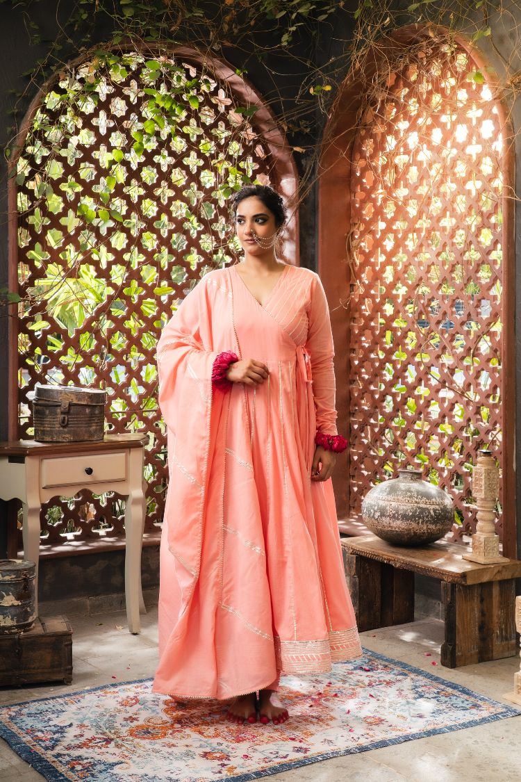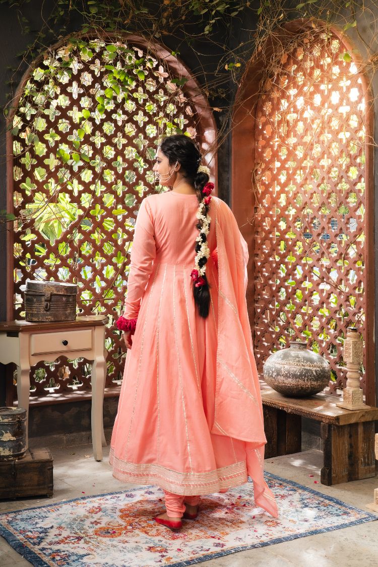 'SAHIBA' Peach Mulmul Cotton Anarkali (Set Of 3)
