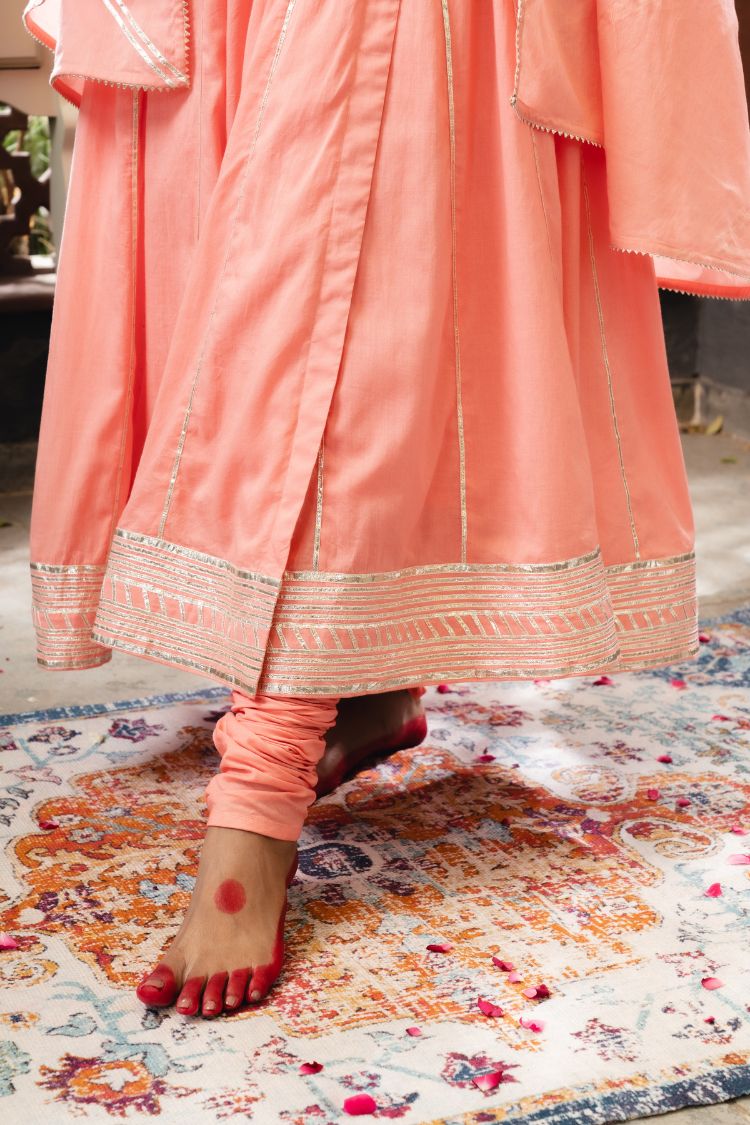 Pure mul cotton Anarkali set with our signature handcrafted gota work, paired with a soft cambric cotton churidar and a mul cotton dupatta.