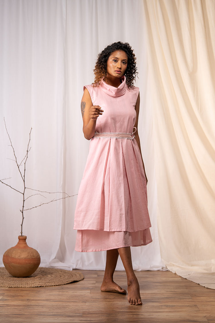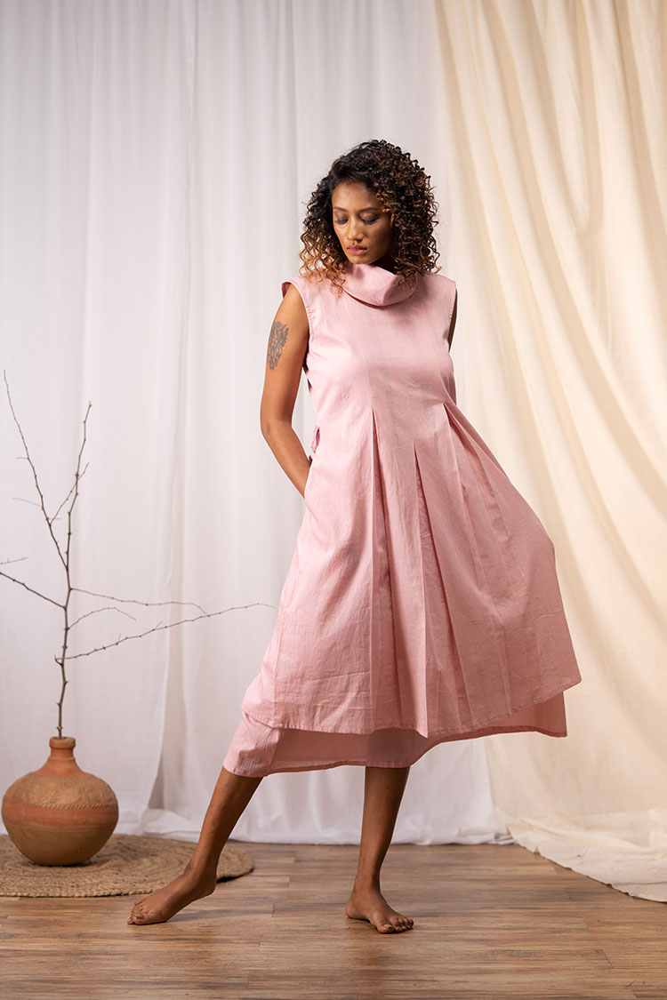 Get this sleeveless cowl neck dress. It has box pleats in front and comes with two layers of soft mulmul.