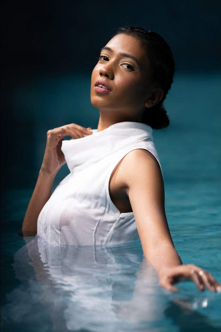 Get this sleeveless cowl neck dress. It has box pleats in front and comes with two layers of soft mulmul.