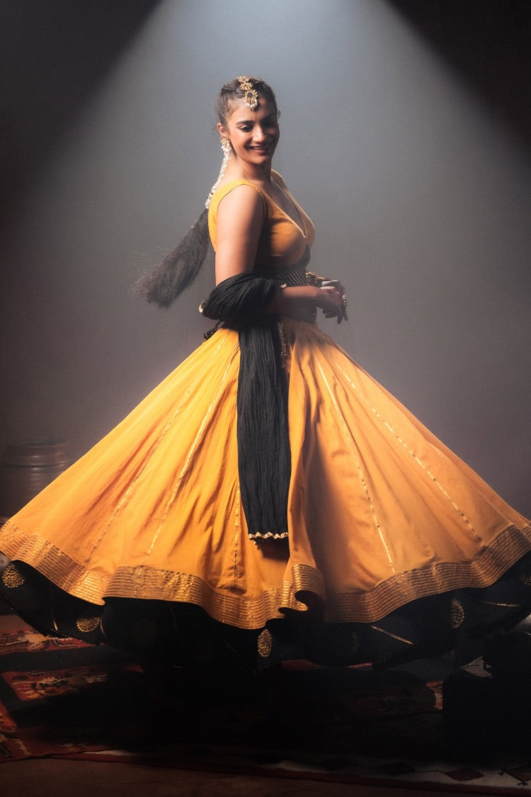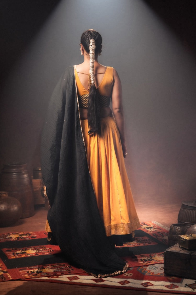 'SWARNIKA' Mustard/Golden And Black Double Layered Mulmul Cotton Ghaghra