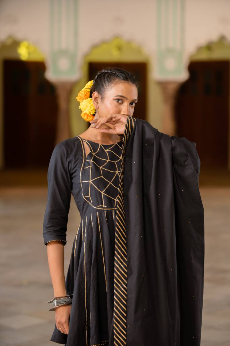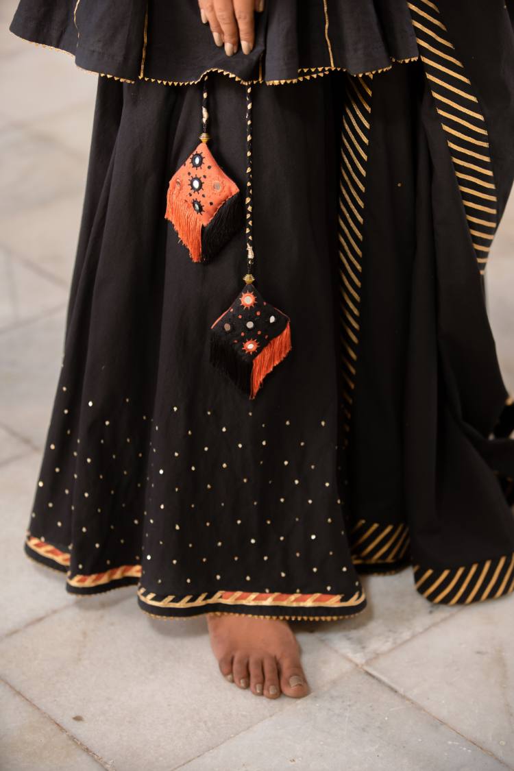 'ULFAT' Black Mulmul Cotton Kalidar Ghaghra (Set Of 3)