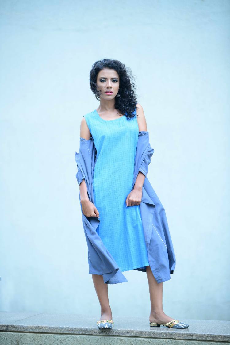 Calf length sleeveless dress comes with an overlay shrug in handloom cotton.